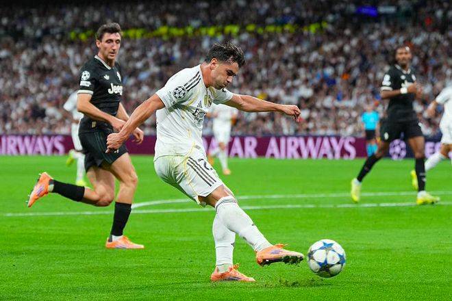 第57分钟,维尼修斯禁区内闪转腾挪连过两人,之后的射门击中立柱,贝林厄姆补射破门,打进个人赛季首球。