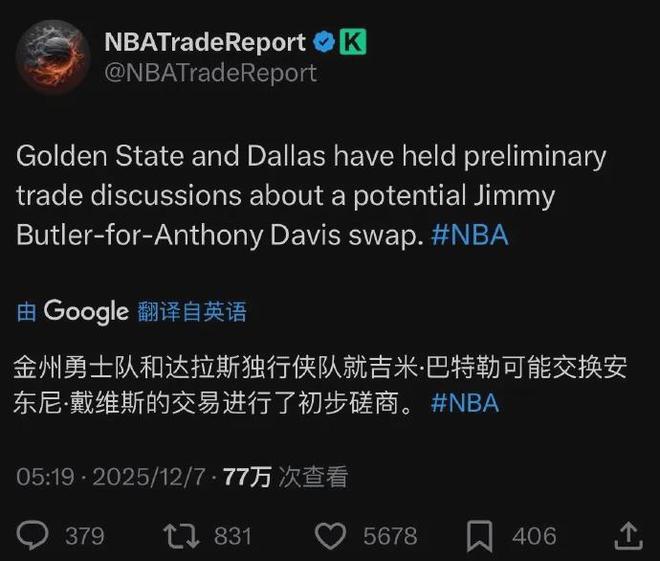 据美媒报道,勇士和独行侠可能就巴特勒(本赛季薪资5413万美元)与浓眉哥(5413万美元)互换东家的交易进行了初步磋商。